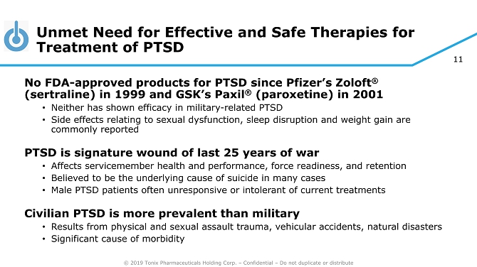 10 © 2019 Tonix Pharmaceuticals Holding Corp. – Confidential – Do not duplicate or distribute Prevalence of PTSD Among Civilians and Veterans 1 Goldstein et al., 2016 (adjusted for 2019) ; 2 Norris, PTSD Res Quar. 2013; 3 Analysis of VA Health Care Utilization among Operation Enduring Freedom, Operation Iraqi Freedom, and Operation New Dawn Vete ran s, from 1st Qtr FY 2002 through 2nd Qtr FY 2015, Washington, DC ; Among 1.9M separated OEF/OIF/OND veterans, 1.2M have obtained VA healthcare; 685k evaluated by VA with possible mental disorder, and 379k diagnosed with PTSD. >19% Iraq/Afghanistan 3 4.7% Adult population 1 19 - 31% Vietnam veterans 2 12 million American adults annually 1 Women more likely to develop than men 1
