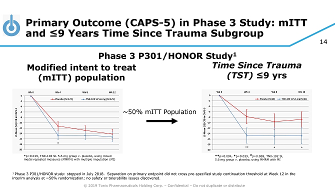 13 © 2019 Tonix Pharmaceuticals Holding Corp. – Confidential – Do not duplicate or distribute TNX - 102 SL Phase 2 Dose - Effect in Military - Related PTSD 1 1 Completed Phase 2 P201/AtEase study: Retrospective analysis of TNX - 102 SL 5.6 mg on CAPS - 5 ≥33 (high - moderate) subgroup. Primary analysis of P201/ AtEase , based on TNX - 102 SL 2.8 mg in participants with entry CAPS - 5 ≥29 ( moderate PTSD severity), was not statistically significant. 2 CAPS - 5 = Clinician administered PTSD Scale for DSM - 5 7.2 points ** p<0.01, * p<0.025, TNX - 102 SL 5.6 mg group with placebo, MMRM with multiple imputation (MI); * p=0.018, TNX - 102 SL 2.8 mg group with placebo, MMRM with MI PTSD Symptoms (CAPS - 5 2 Score) Remission = Loss of Diagnosis and CAPS - 5 < 11 Asterisk and hashmark represent pairwise comparisons between TNX - 102 SL and Placebo; # p=0.08, Odds Ratio 3.01 (0.89, 10.18) *p=0.02, Odds Ratio 4.60 (1.27, 16.66); logistic regression 5.20% 14.30% 21.10% 0% 5% 10% 15% 20% 25% 30% Weeks 8 & 12 Percent in Remission Placebo (N=77) Tonmya 2.8 mg (N=70) Tonmya 5.6 mg (N=38) # * Remission at Weeks 8 & 12