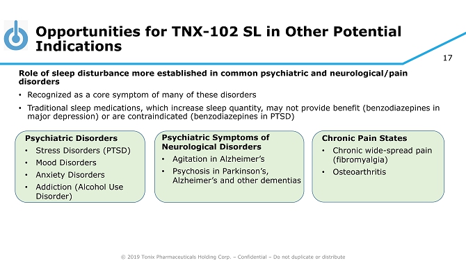 16 © 2019 Tonix Pharmaceuticals Holding Corp. – Confidential – Do not duplicate or distribute TNX - 102 SL for PTSD: Phase 3 P302/RECOVERY Study Expecting Topline Data in 2Q 2020 Primary e ndpoint: • CAPS - 5 1 mean change from baseline at Week 4 (TNX - 102 SL 5.6 mg vs. placebo) Key Secondary e ndpoint s include: • CAPS - 5 m ean change from baseline at W eek 12 (TNX - 102 SL 5.6 mg vs. placebo ) • Change from baseline Clinical Global Impression – Severity scale • Change from baseline Sheehan Disability Scale total score Potential pivotal efficacy study to support NDA approval Placebo once - daily at bedtime 12 weeks TNX - 102 SL once - daily at bedtime 5.6 mg (2 x 2.8 mg tablets) General s tudy c haracteristics: • Randomized, double - blind, placebo - controlle d study with baseline CAPS - 5 1 ≥ 33 in approximately 30 U.S. sites • Enrollment restricted to study participants with PTSD who experienced an index trauma ≤ 9 years from the date of screening • Both civilian and military - related PTSD to be included 1 CAPS - 5 = Clinician - Administered PTSD Scale for DSM - 5 N= 125 N= 125