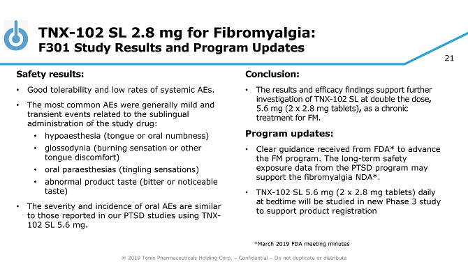 20 © 2019 Tonix Pharmaceuticals Holding Corp. – Confidential – Do not duplicate or distribute TNX - 102 SL 2.8 mg for Fibromyalgia: Summary of Completed Phase 3 Study F301 and Results General s tudy c haracteristics: • Randomized, 12 - week, double - blind, placebo - controlle d Phase 3 study of TNX - 102 SL 2.8 mg (half the dose being developed for PTSD) taken daily at bedtime (n=519) • Patients had to satisfy the 2010 ACR Preliminary Diagnostic Classification Criteria • Primary endpoint: Weekly average pain improvement as a 30% responder analysis • Secondary endpoints: PGIC, FIQ - R Symptom Domain, FIQ - R Function Domain, Daily Sleep Quality Diary, PROMIS Sleep Disturbance Efficacy results: • Completers: 425 (81.9%) of 519 patients in Intent - to - Treat population • The primary analysis (responder analysis) was not statistically significant (P=0.095). However, secondary analysis of average pain improvement after 12 weeks of treatment showed nominal significance (P<0.001, mixed model repeated measures) • Significant improvements observed in sleep quality, patient global impression of change and fibromyalgia - specific measures (secondary analyses).