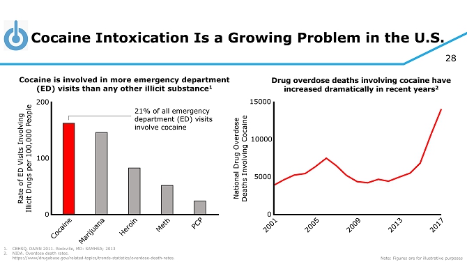 28 Cocaine Intoxication Is a Growing Problem in the U.S. National Drug Overdose Deaths Involving Cocaine 0 5000 10000 15000 Cocaine is involved in more emergency department (ED) visits than any other illicit substance 1 Drug overdose deaths involving cocaine have increased dramatically in recent years 2 1. CBHSQ. DAWN 2011. Rockville, MD: SAMHSA; 2013 2. NIDA. Overdose death rates. https://www/drugabuse.gov/related - topics/trends - statistics/overdose - death - rates. Note: Figures are for illustrative purposes Rate of ED Visits Involving Illicit Drugs per 100,000 People 0 100 200 21% of all emergency department (ED) visits involve cocaine