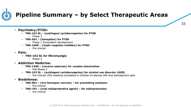32 © 2019 Tonix Pharmaceuticals Holding Corp. – Confidential – Do not duplicate or distribute Capitalization Table* As of 10/31/2019 # of Shares WAEP $ Value % of Fully Diluted Common Shares Outstanding (D&O) 6,853 0.3% Common Shares Outstanding (Other) 1,564,888 71.9% Warrants 496,486 $42.14 $20.9M 22.8% Stock Options 109,036 $199.57 $21.8M 5.0% Fully Diluted Shares Outstanding 2,177,263 100% *All share and dollar amounts reflect a 1 - for - 10 reverse stock split which will be effective for trading purposes as of the comm encement of trading on November 1, 2019. Any fractional share of common stock that would otherwise result from the reverse stock split will be rounded to a whole shar e.