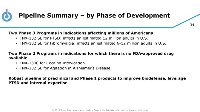 33 © 2019 Tonix Pharmaceuticals Holding Corp. – Confidential – Do not duplicate or distribute Pipeline Summary – by Select Therapeutic Areas • Psychiatry/PTSD: • TNX - 102 SL – (sublingual cyclobenzaprine) for PTSD • Phase 3 • TNX - 601 – (tianeptine) for PTSD • Phase 1 formulation development • TNX - 1600 – (triple reuptake inhibitor) for PTSD • Pre - clinical • Pain: • TNX - 102 SL for fibromyalgia • Phase 3 • Addiction Medicine: • TNX - 1300 – (cocaine esterase) for cocaine intoxication • Mid - Phase 2 • TNX - 102 SL – (sublingual cyclobenzaprine) for alcohol use disorder (AUD) • Pre - clinical; FDA meeting completed in October to discuss IND and development plan • Biodefense: • TNX - 801 – (live horsepox vaccine) – for preventing smallpox • Pre - clinical • TNX - 701 – (oral radioprotective agent) – for radioprotection • Pre - clinical