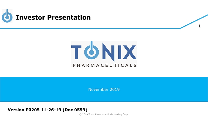 © 2019 Tonix Pharmaceuticals Holding Corp. 1 November 2019 Version P0205 11 - 26 - 19 (Doc 0559) Investor Presentation