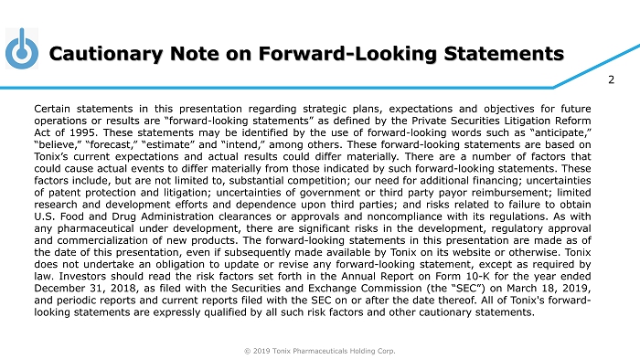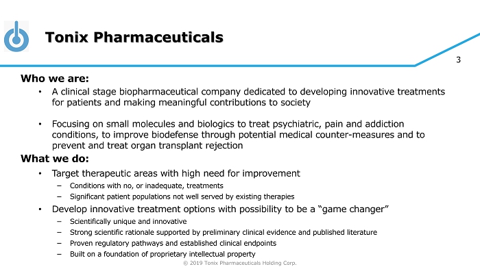 © 2019 Tonix Pharmaceuticals Holding Corp. 2 Cautionary Note on Forward - Looking Statements Certain statements in this presentation regarding strategic plans, expectations and objectives for future operations or results are “forward - looking statements” as defined by the Private Securities Litigation Reform Act of 1995 . These statements may be identified by the use of forward - looking words such as “anticipate,” “believe,” “forecast,” “estimate” and “intend,” among others . These forward - looking statements are based on Tonix’s current expectations and actual results could differ materially . There are a number of factors that could cause actual events to differ materially from those indicated by such forward - looking statements . These factors include, but are not limited to, substantial competition ; our need for additional financing ; uncertainties of patent protection and litigation ; uncertainties of government or third party payor reimbursement ; limited research and development efforts and dependence upon third parties ; and risks related to failure to obtain U . S . Food and Drug Administration clearances or approvals and noncompliance with its regulations . As with any pharmaceutical under development, there are significant risks in the development, regulatory approval and commercialization of new products . The forward - looking statements in this presentation are made as of the date of this presentation, even if subsequently made available by Tonix on its website or otherwise . Tonix does not undertake an obligation to update or revise any forward - looking statement, except as required by law . Investors should read the risk factors set forth in the Annual Report on Form 10 - K for the year ended December 31 , 2018 , as filed with the Securities and Exchange Commission (the “SEC”) on March 18 , 2019 , and periodic reports and current reports filed with the SEC on or after the date thereof . All of Tonix's forward - looking statements are expressly qualified by all such risk factors and other cautionary statements .