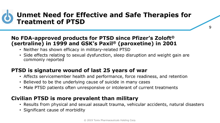 © 2019 Tonix Pharmaceuticals Holding Corp. 8 Prevalence of PTSD Among Civilians and Veterans 1 Goldstein et al., 2016 (adjusted for 2019) ; 2 Norris, PTSD Res Quar. 2013; 3 Analysis of VA Health Care Utilization among Operation Enduring Freedom, Operation Iraqi Freedom, and Operation New Dawn Vete ran s, from 1st Qtr FY 2002 through 2nd Qtr FY 2015, Washington, DC ; Among 1.9M separated OEF/OIF/OND veterans, 1.2M have obtained VA healthcare; 685k evaluated by VA with possible mental disorder, and 379k diagnosed with PTSD. >19% Iraq/Afghanistan 3 4.7% Adult population 1 19 - 31% Vietnam veterans 2 12 million American adults annually 1 Women more likely to develop than men 1