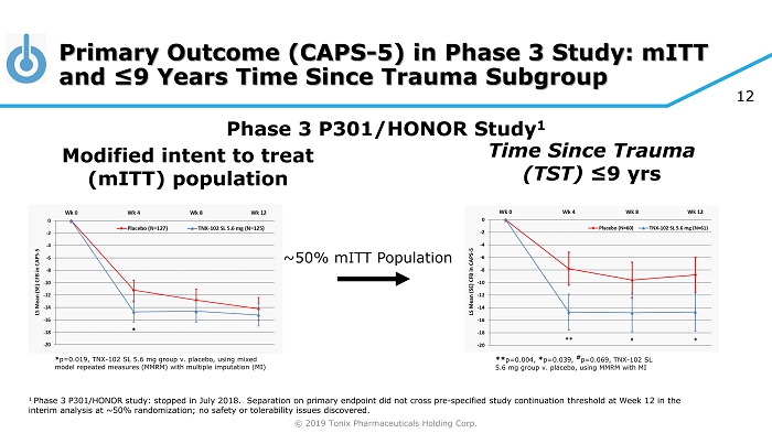 © 2019 Tonix Pharmaceuticals Holding Corp. 11 TNX - 102 SL Phase 2 Dose - Effect in Military - Related PTSD 1 1 Completed Phase 2 P201/AtEase study: Retrospective analysis of TNX - 102 SL 5.6 mg on CAPS - 5 ≥33 (high - moderate) subgroup. Primary analysis of P201/ AtEase , based on TNX - 102 SL 2.8 mg in participants with entry CAPS - 5 ≥29 ( moderate PTSD severity), was not statistically significant. 2 CAPS - 5 = Clinician administered PTSD Scale for DSM - 5 7.2 points ** p<0.01, * p<0.025, TNX - 102 SL 5.6 mg group with placebo, MMRM with multiple imputation (MI); * p=0.018, TNX - 102 SL 2.8 mg group with placebo, MMRM with MI PTSD Symptoms (CAPS - 5 2 Score) Remission = Loss of Diagnosis and CAPS - 5 < 11 Asterisk and hashmark represent pairwise comparisons between TNX - 102 SL and Placebo; # p=0.08, Odds Ratio 3.01 (0.89, 10.18) *p=0.02, Odds Ratio 4.60 (1.27, 16.66); logistic regression 5.20% 14.30% 21.10% 0% 5% 10% 15% 20% 25% 30% Weeks 8 & 12 Percent in Remission Placebo (N=77) Tonmya 2.8 mg (N=70) Tonmya 5.6 mg (N=38) # * Remission at Weeks 8 & 12