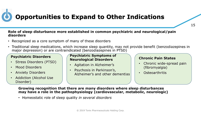 © 2019 Tonix Pharmaceuticals Holding Corp. 14 TNX - 102 SL for PTSD: Phase 3 P302/RECOVERY Study Expecting Interim Analysis Results in 1Q 2020 Potential pivotal efficacy study to support NDA approval Primary e ndpoint: • CAPS - 5 1 mean change from baseline at Week 12 (TNX - 102 SL 5.6 mg vs. placebo) Key Secondary e ndpoint s include: • Change from baseline Clinical Global Impression – Severity scale • Change from baseline Sheehan Disability Scale total score Interim analysis results expected 1Q 2020 Topline data expected 2Q 2020 Placebo once - daily at bedtime 12 weeks TNX - 102 SL once - daily at bedtime 5.6 mg (2 x 2.8 mg tablets) General s tudy c haracteristics: • Randomized, double - blind, placebo - controlle d study with baseline CAPS - 5 1 ≥ 33 in approximately 30 U.S. sites • Enrollment restricted to study participants with PTSD who experienced an index trauma ≤ 9 years from the date of screening • Both civilian and military - related PTSD to be included 1 CAPS - 5 = Clinician - Administered PTSD Scale for DSM - 5 N= 125 N= 125