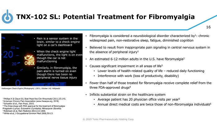 © 2019 Tonix Pharmaceuticals Holding Corp. 15 Opportunities to Expand to Other Indications Growing recognition that there are many disorders where sleep disturbances may have a role in the pathophysiology (cardiovascular, metabolic, neurologic) • Homeostatic role of sleep quality in several disorders Psychiatric Disorders • Stress Disorders (PTSD) • Mood Disorders • Anxiety Disorders • Addiction (Alcohol Use Disorder) Chronic Pain States • Chronic wide - spread pain (fibromyalgia) • Osteoarthritis Role of sleep disturbance more established in common psychiatric and neurological/pain disorders • Recognized as a core symptom of many of these disorders • Traditional sleep medications, which increase sleep quantity, may not provide benefit (benzodiazepines in major depression) or are contraindicated (benzodiazepines in PTSD) Psychiatric Symptoms of Neurological Disorders • Agitation in Alzheimer’s • Psychosis in Parkinson’s, Alzheimer’s and other dementias