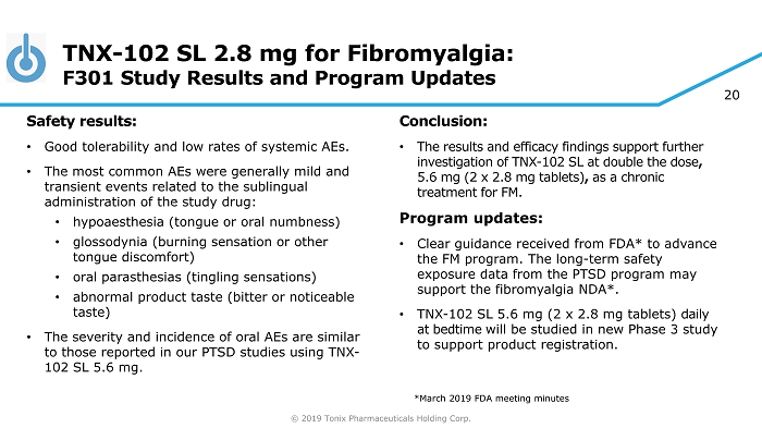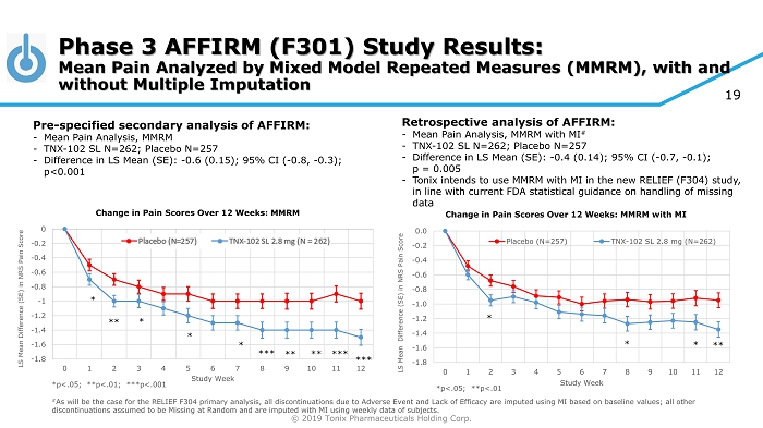 © 2019 Tonix Pharmaceuticals Holding Corp. 18 TNX - 102 SL 2.8 mg for Fibromyalgia: Summary of Completed Phase 3 AFFIRM Study (F301) and Results General s tudy c haracteristics: • Randomized, 12 - week, double - blind, placebo - controlle d Phase 3 study of TNX - 102 SL 2.8 mg (half the dose being developed for PTSD) taken daily at bedtime (n=519) • Patients had to satisfy the 2010 ACR Preliminary Diagnostic Classification Criteria • Primary endpoint: Weekly average pain improvement as a 30% responder analysis • Secondary endpoints: PGIC, FIQ - R Symptom Domain, FIQ - R Function Domain, Daily Sleep Quality Diary, PROMIS Sleep Disturbance Efficacy results: • Completers: 425 (81.9%) of 519 patients in Intent - to - Treat population • The primary analysis (responder analysis) was not statistically significant (P=0.095). However, the pre - specified secondary analysis of average pain improvement after 12 weeks of treatment showed P<0.001, mixed model repeated measures (MMRM) • Significant improvements observed in sleep quality, patient global impression of change and fibromyalgia - specific measures (secondary analyses) PGIC = Patient Global Impression of Pain FIQ - R = Fibromyalgia Impact Questionnaire – Revised MMRM = mixed model repeated measures