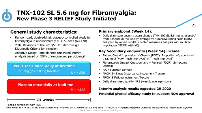 © 2019 Tonix Pharmaceuticals Holding Corp. 20 TNX - 102 SL 2.8 mg for Fibromyalgia: F301 Study Results and Program Updates Safety results: • Good tolerability and low rates of systemic AEs. • The most common AEs were generally mild and transient events related to the sublingual administration of the study drug: • hypoaesthesia (tongue or oral numbness) • glossodynia (burning sensation or other tongue discomfort) • oral parasthesias (tingling sensations) • abnormal product taste (bitter or noticeable taste) • The severity and incidence of oral AEs are similar to those reported in our PTSD studies using TNX - 102 SL 5.6 mg. Conclusion: • The results and efficacy findings support further investigation of TNX - 102 SL at double the dose , 5.6 mg (2 x 2.8 mg tablets) , as a chronic treatment for FM. Program updates: • Clear guidance received from FDA* to advance the FM program. The long - term safety exposure data from the PTSD program may support the fibromyalgia NDA*. • TNX - 102 SL 5.6 mg (2 x 2.8 mg tablets) daily at bedtime will be studied in new Phase 3 study to support product registration. *March 2019 FDA meeting minutes