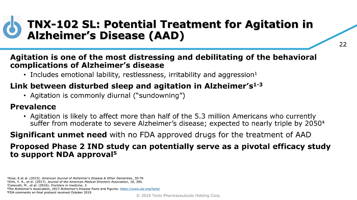 © 2019 Tonix Pharmaceuticals Holding Corp. 21 TNX - 102 SL 5.6 mg for Fibromyalgia: New Phase 3 RELIEF Study Initiated Primary e ndpoint (Week 14) : • Daily diary pain severity score change (TNX - 102 SL 5.6 mg vs. placebo) from Baseline in the weekly average by numerical rating scale (NRS) analyzed by mixed model repeated measures analysis with multiple imputation (MMRM with MI) Key Secondary e ndpoint s (Week 14) include: • Patient Global Impression of Change (PGIC): Proportion of patients with a rating of “very much improved” or “much improved” • Fibromyalgia Impact Questionnaire – Revised (FIQR): Symptoms Domain • FIQR Function Domain • PROMIS* Sleep Disturbance instrument T - score • PROMIS Fatigue instrument T - score • Daily diary sleep quality NRS (weekly average) score Interim analysis results expected 2H 2020 Potential pivotal efficacy study to support NDA approval Placebo once - daily at bedtime 14 weeks TNX - 102 SL once - daily at bedtime 5.6 mg (2 x 2.8 mg tablets) 2 General s tudy c haracteristics: • Randomized, double - blind, placebo - controlle d study in fibromyalgia in approximately 40 U.S. sites (N=470) • 2016 Revisions to the 2010/2011 Fibromyalgia Diagnostic Criteria for inclusion • Adaptive Design: one planned unblinded interim analysis based on 50% of randomized participants 1 1 Pending agreement with FDA 2 Two week run in at 2.8 mg dose at bedtime, followed by 12 weeks at 5.6 mg dose N= ~235 N= 250 N= ~235 *PROMIS = Patient Reported Outcome Measurement Information System