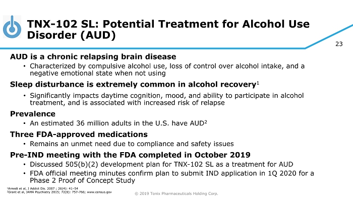 © 2019 Tonix Pharmaceuticals Holding Corp. 23 TNX - 102 SL: Potential Treatment for Alcohol Use Disorder (AUD) AUD is a chronic relapsing brain disease • Characterized by compulsive alcohol use, loss of control over alcohol intake, and a negative emotional state when not using Sleep disturbance is extremely common in alcohol recovery 1 • Significantly impacts daytime cognition, mood, and ability to participate in alcohol treatment, and is associated with increased risk of relapse Prevalence • An estimated 36 million adults in the U.S. have AUD 2 Three FDA - approved medications • Remains an unmet need due to compliance and safety issues Pre - IND meeting with the FDA completed in October 2019 • Discussed 505(b)(2) development plan for TNX - 102 SL as a treatment for AUD • FDA official meeting minutes confirm plan to submit IND application in 1Q 2020 for a Phase 2 Proof of Concept Study 1 Arnedt et al, J Addict Dis. 2007 ; 26(4): 41 – 54 2 Grant et al, JAMA Psychiatry 2015; 72(8): 757 - 766; www.census.gov