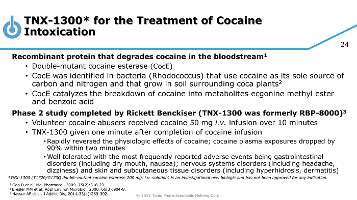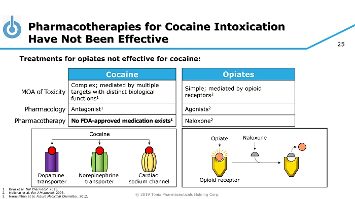 © 2019 Tonix Pharmaceuticals Holding Corp. 24 TNX - 1300* for the Treatment of Cocaine Intoxication Recombinant protein that degrades cocaine in the bloodstream 1 • Double - mutant cocaine esterase ( CocE ) • CocE was identified in bacteria ( Rhodococcus ) that use cocaine as its sole source of carbon and nitrogen and that grow in soil surrounding coca plants 2 • CocE catalyzes the breakdown of cocaine into metabolites ecgonine methyl ester and benzoic acid Phase 2 study comp leted by Rickett Benckiser (TNX - 1300 was formerly RBP - 8000) 3 • Volunteer cocaine abusers received cocaine 50 mg i.v. infusion over 10 minutes • TNX - 1300 given one minute after completion of cocaine infusion • Rapidly reversed the physiologic effects of cocaine; cocaine plasma exposures dropped by 90% within two minutes • Well tolerated with the most frequently reported adverse events being gastrointestinal disorders ( including dry mouth, nausea); nervous systems disorders (including headache, dizziness) and skin and subcutaneous tissue disorders (including hyperhidrosis , dermatitis) *TNX - 1300 (T172R/G173Q double - mutant cocaine esterase 200 mg, i.v. solution) is an investigational new biologic and has not been approved for any indication. 1 Gao D et al, Mol Pharmacol . 2009. 75(2):318 - 23. 2 Bresler MM et al, Appl Environ Microbiol . 2000. 66(3):904 - 8. 3 Nasser AF et al, J Addict Dis . 2014;33(4):289 - 302.