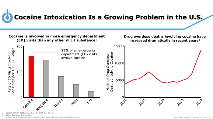 Cocaine Intoxication Is a Growing Problem in the U.S. National Drug Overdose Deaths Involving Cocaine 0 5000 10000 15000 Cocaine is involved in more emergency department (ED) visits than any other illicit substance 1 Drug overdose deaths involving cocaine have increased dramatically in recent years 2 1. CBHSQ. DAWN 2011. Rockville, MD: SAMHSA; 2013 2. NIDA. Overdose death rates. https://www/drugabuse.gov/related - topics/trends - statistics/overdose - death - rates. Note: Figures are for illustrative purposes Rate of ED Visits Involving Illicit Drugs per 100,000 People 0 100 200 21% of all emergency department (ED) visits involve cocaine