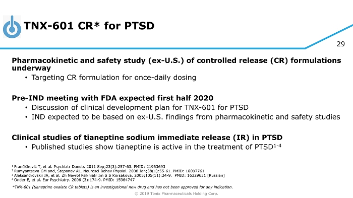 © 2019 Tonix Pharmaceuticals Holding Corp. 28 TNX - 601 CR* (Tianeptine Oxalate): A Potential Daytime Treatment for PTSD Pre - IND Candidate Targeted as a 1 st line monotherapy for PTSD: oral formulation for daytime dosing • Tianeptine sodium (amorphous), first marketed for depression in France in 1989, is approved as an antidepressant in the EU, Russia, Asia and Latin America; established post - marketing experience • Identified new oxalate salt with improved pharmaceutical properties ideal for reformulation • Preliminary human pharmacokinetic and safety data (non - IND study) from selected controlled release (CR) formulation expected in fourth quarter of 2019 Issued patents directed to tianeptine and tianeptine oxalate • Method of Use: Issued European patent directed to methods of treating cognitive impairment associated with corticosteroid treatment, European Patent No. 3246031 • Composition of Matter: Issued US patent directed to oxalate salt, U.S. Patent No. 10,449,203 PTSD is a heterogeneous condition, so not all patients are expected to respond to a single medicine • Distinct mechanism of action from TNX - 102 SL – modulates the glutamatergic system • Leverages Tonix expertise in PTSD (clinical and regulatory, market analysis, etc.) Targeting a Condition with Significant Unmet Need *TNX - 601 (tianeptine oxalate CR tablets) is an investigational new drug and has not been approved for any indication.