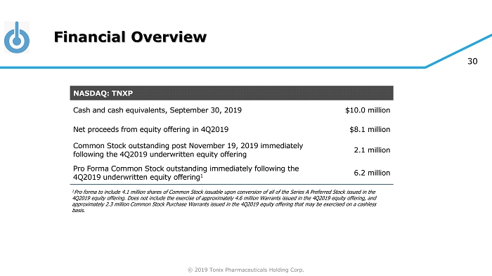 © 2019 Tonix Pharmaceuticals Holding Corp. 30 Financial Overview [new slide] NASDAQ: TNXP Cash and cash equivalents, September 30, 2019 $10.0 million Net proceeds from equity offering in 4Q2019 $8.1 million Common Stock outstanding post November 19, 2019 immediately following the 4Q2019 underwritten equity offering 2.1 million Pro Forma Common Stock outstanding immediately following the 4Q2019 underwritten equity offering 1 6.2 million 1 Pro forma to include 4.1 million shares of Common Stock issuable upon conversion of all of the Series A Preferred Stock issue d i n the 4Q2019 equity offering. Does not include the exercise of approximately 4.6 million Warrants issued in the 4Q2019 equity offer ing , and approximately 2.3 million Common Stock Purchase Warrants issued in the 4Q2019 equity offering that may be exercised on a cash les s basis.