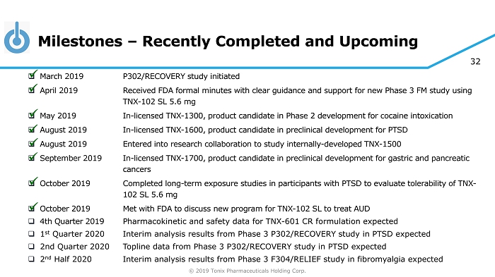 © 2019 Tonix Pharmaceuticals Holding Corp. 31 Management Team Seth Lederman, MD President & CEO Jessica Morris Chief Operating Officer Gregory Sullivan, MD Chief Medical Officer Bradley Saenger, CPA Chief Financial Officer