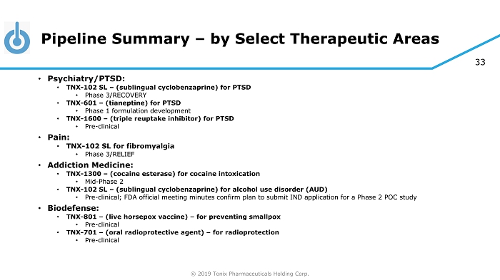 © 2019 Tonix Pharmaceuticals Holding Corp. 32 Milestones – Recently Completed and Upcoming □ March 2019 P302/RECOVERY study initiated □ April 2019 Received FDA formal minutes with clear guidance and support for new Phase 3 FM study using TNX - 102 SL 5.6 mg □ May 2019 In - licensed TNX - 1300, product candidate in Phase 2 development for cocaine intoxication □ August 2019 In - licensed TNX - 1600, product candidate in preclinical development for PTSD □ August 2019 Entered into research collaboration to study internally - developed TNX - 1500 □ September 2019 In - licensed TNX - 1700, product candidate in preclinical development for gastric and pancreatic cancers □ October 2019 Completed long - term exposure studies in participants with PTSD to evaluate tolerability of TNX - 102 SL 5.6 mg □ October 2019 Met with FDA to discuss new program for TNX - 102 SL to treat AUD □ 4th Quarter 2019 P harmacokinetic and safety data for TNX - 601 CR formulation expected □ 1 st Quarter 2020 Interim analysis results from Phase 3 P302/RECOVERY study in PTSD expected □ 2nd Quarter 2020 Topline data from Phase 3 P302/RECOVERY study in PTSD expected □ 2 nd Half 2020 Interim analysis results from Phase 3 F304/RELIEF study in fibromyalgia expected x x x x x x x x