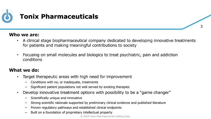 © 2019 Tonix Pharmaceuticals Holding Corp. 2 Cautionary Note on Forward - Looking Statements Certain statements in this presentation regarding strategic plans, expectations and objectives for future operations or results are “forward - looking statements” as defined by the Private Securities Litigation Reform Act of 1995 . These statements may be identified by the use of forward - looking words such as “anticipate,” “believe,” “forecast,” “estimate” and “intend,” among others . These forward - looking statements are based on Tonix’s current expectations and actual results could differ materially . There are a number of factors that could cause actual events to differ materially from those indicated by such forward - looking statements . These factors include, but are not limited to, substantial competition ; our need for additional financing ; uncertainties of patent protection and litigation ; uncertainties of government or third party payor reimbursement ; limited research and development efforts and dependence upon third parties ; and risks related to failure to obtain U . S . Food and Drug Administration clearances or approvals and noncompliance with its regulations . As with any pharmaceutical under development, there are significant risks in the development, regulatory approval and commercialization of new products . The forward - looking statements in this presentation are made as of the date of this presentation, even if subsequently made available by Tonix on its website or otherwise . Tonix does not undertake an obligation to update or revise any forward - looking statement, except as required by law . Investors should read the risk factors set forth in the Annual Report on Form 10 - K for the year ended December 31 , 2018 , as filed with the Securities and Exchange Commission (the “SEC”) on March 18 , 2019 , and periodic reports and current reports filed with the SEC on or after the date thereof . All of Tonix's forward - looking statements are expressly qualified by all such risk factors and other cautionary statements .