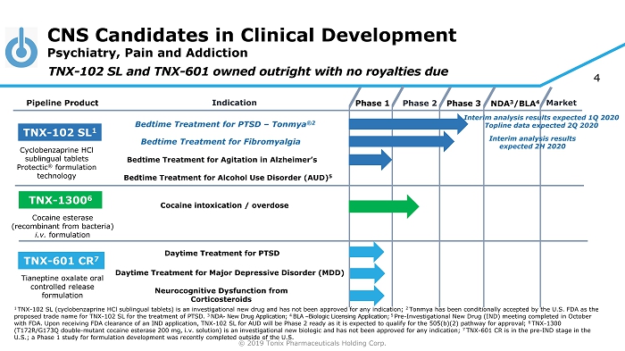 © 2019 Tonix Pharmaceuticals Holding Corp. 3 Tonix Pharmaceuticals Who we are: • A clinical stage biopharmaceutical company dedicated to developing innovative treatments for patients and making meaningful contributions to society • Focusing on small molecules and biologics to treat psychiatric, pain and addiction conditions What we do: • Target therapeutic areas with high need for improvement − Conditions with no, or inadequate, treatments − Significant patient populations not well served by existing therapies • Develop innovative treatment options with possibility to be a “game changer” − Scientifically unique and innovative − Strong scientific rationale supported by preliminary clinical evidence and published literature − Proven regulatory pathways and established clinical endpoints − Built on a foundation of proprietary intellectual property