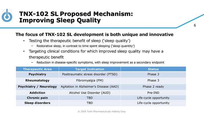 © 2019 Tonix Pharmaceuticals Holding Corp. 5 Preclinical Pipeline 1 1 (Experimental new medicines and biologics, not approved for any indication 2 (2S,4R,5R) - 5 - (((2 - aminobenzo[d]thiazol - 6 - yl)methyl)amino) - 2 - (bis(4 - fluorophenyl)methyl)tetrahydro - 2H - pyran - 4 - ol) is an inhibitor of reuptake of three monoamine neurotransmitters (serotonin, norepinephrine and dopamine) 3 Programs owned outright with no royalties due 4 recombinant Trefoil Family Factor 2 Category Pipeline Product Indication(s) TNX - 801 3 Smallpox - preventing vaccine Live horsepox virus (HPXV) vaccine from cell culture TNX - 701 3 Protection from radiation injury Radioprotection drug oral capsules Triple reuptake inhibitor 2 TNX - 1600 Daytime Treatment for PTSD Psychiatry TNX - 1500 3 Anti - CD154 monoclonal antibody Prevention and treatment of organ transplant rejection Treatment for autoimmune conditions including systemic lupus erythematosus, rheumatoid arthritis and multiple sclerosis Autoimmunity Transplant TNX - 1700 rTFF2 4 Treatment for gastric and pancreatic cancers Oncology Biodefense Biodefense
