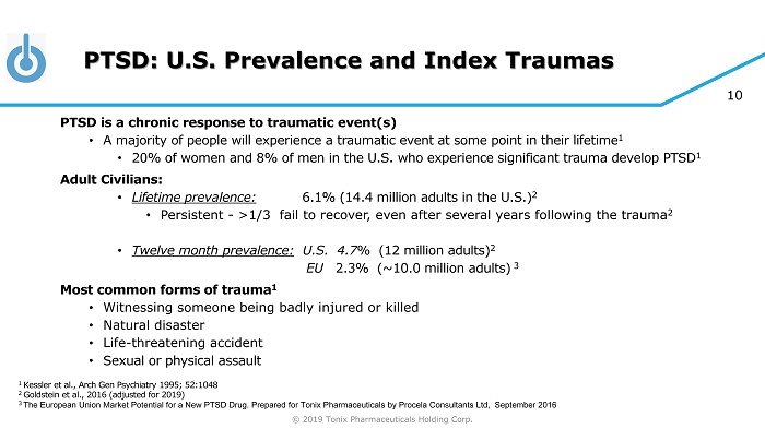 © 2019 Tonix Pharmaceuticals Holding Corp. 9 Impact of PTSD on People Consequences: • Impaired daily function and substantial interference with work and social interactions • Reckless or destructive behavior • Increased health care utilization and greater medical morbidity PTSD as a risk factor for: • Depression • Alcohol or substance abuse • Absenteeism/unemployment • Homelessness • Violent acts • Suicidal thoughts and suicide
