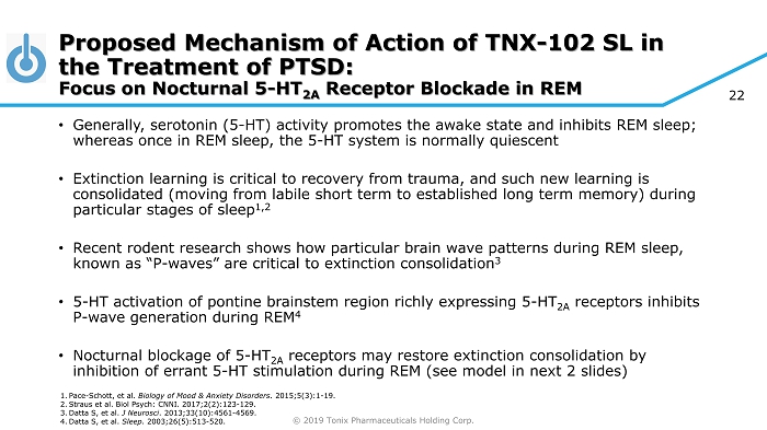 © 2019 Tonix Pharmaceuticals Holding Corp. 21 TNX - 102 SL: Hypothesized Novel Mechanism Targets Sleep Quality for Recovery from PTSD PTSD is a disorder of recovery • Most people exposed to extreme trauma recover over a few weeks • In PTSD, recovery process impeded due to insufficient sleep - dependent memory processing 1,2 Memory processing is essential to recovery • Vulnerability to memory intrusions and trauma triggers remains if no consolidation of new learning (extinction) TNX - 102 SL targets sleep quality 3 • The active ingredient in TNX - 102 SL, cyclobenzaprine, interacts with receptors that regulate sleep quality: strongly binds and potently blocks 5 - HT 2A , a 1 - adrenergic and histamine H 1 receptors, permissive to sleep - dependent recovery processes 1 Straus LD, Acheson DT, Risbrough VB, Drummond SPA. Sleep Deprivation Disrupts Recall of Conditioned Fear Extinction. Biol Psychiatry Cogn Neurosci Neuroimaging. 2017; 2(2):123 - 129. 2 Murkar ALA, De Koninck J. Consolidative mechanisms of emotional processing in REM sleep and PTSD. Sleep Med Rev. 2018; 41:173 - 184. 3 Daugherty et al., Abstract 728, Society of Biological Psychiatry 70th Annual Scientific Convention, May 14 - 16, 2015, Toronto Ont ario, Canada