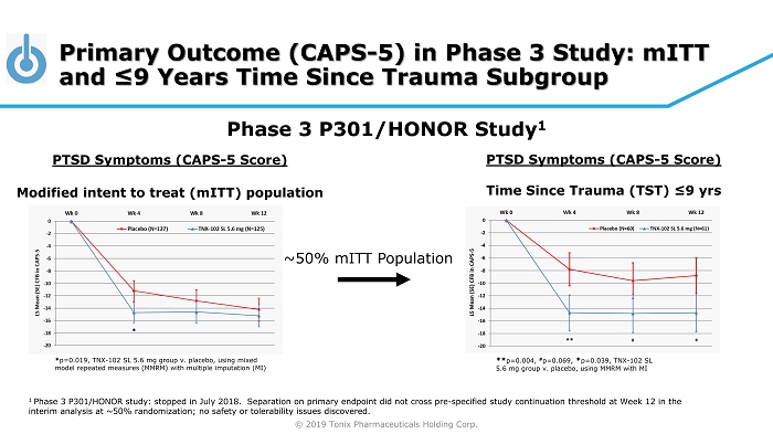 © 2019 Tonix Pharmaceuticals Holding Corp. Primary Outcome (CAPS - 5) in Phase 3 Study: mITT and ≤9 Years Time Since Trauma Subgroup PTSD Symptoms (CAPS - 5 Score) Modified intent to treat ( mITT ) population Phase 3 P301/HONOR Study 1 ** p=0.004, # p=0.069 , * p=0.039, TNX - 102 SL 5.6 mg group v. placebo, using MMRM with MI ~50% mITT Population * p=0.019, TNX - 102 SL 5.6 mg group v. placebo, using mixed model repeated measures (MMRM) with multiple imputation (MI) PTSD Symptoms (CAPS - 5 Score) Time Since Trauma (TST) ≤9 yrs 1 Phase 3 P301/HONOR study: stopped in July 2018. Separation on primary endpoint did not cross pre - specified study continuation t hreshold at Week 12 in the interim analysis at ~50% randomization; no safety or tolerability issues discovered.