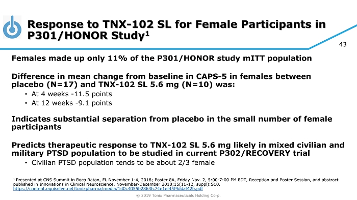 © 2019 Tonix Pharmaceuticals Holding Corp. 43 Response to TNX - 102 SL for Female Participants in P301/HONOR Study 1 Females made up only 11% of the P301/HONOR study mITT population Difference in mean change from baseline in CAPS - 5 in females between placebo (N=17) and TNX - 102 SL 5.6 mg (N=10) was: • At 4 weeks - 11.5 points • At 12 weeks - 9.1 points Indicates substantial separation from placebo in the small number of female participants Predicts therapeutic response to TNX - 102 SL 5.6 mg likely in mixed civilian and military PTSD population to be studied in current P302/RECOVERY trial • Civilian PTSD population tends to be about 2/3 female 1 Presented at CNS Summit in Boca Raton, FL November 1 - 4, 2018; Poster 8A, Friday Nov. 2, 5:00 - 7:00 PM EDT, Reception and Poster S ession, and abstract published in Innovations in Clinical Neuroscience, November - December 2018;15(11 - 12, suppl):S10. https://content.equisolve.net/tonixpharma/media/1d0c4055b2863fc74e1ef45f9ddaf42b.pdf