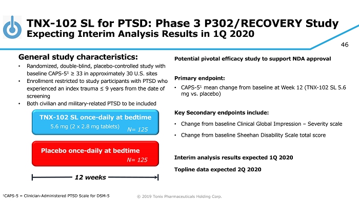 © 2019 Tonix Pharmaceuticals Holding Corp. 45 Summary of Clinical Experience with TNX - 102 SL/ TNX - 102 SL in PTSD Median time since trauma (TST) in TNX - 102 SL 5.6 mg group in the P301/HONOR study (9.5 years) was longer than P201/AtEase study (6 years) • Both studied military - related PTSD • Time has passed since the surge in Iraq In retrospective analysis, the ≤ 9 year TST subgroup of P301 study had similar results as the P201 study (primary and secondary) • TST is important in placebo - controlled clinical study • Potential enrichment in ≤ 9 years TST subgroup for treatment responders The ≤ 9 year TST subgroup of P301 may be enriched for “Remitting Phase” of PTSD 1 - 4 • Expect remitting phase of PTSD is more amenable to drug studies Results from retrospective analyses lead to improved Phase 3 study design 1 Kessler et al. Arch Gen Psychiatry 1995;52:1048 - 1060. 2 Armenta et al. BMC Psychiatry 2018;18:48. 3 Galatzer - Levy et al. PLOS ONE 2013;8:e70084. 4 Perkonigg et al. Am J Psychiatry 2005;162:1320 - 1327.