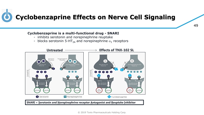 © 2019 Tonix Pharmaceuticals Holding Corp. 48 TNX - 102 SL – Multi - Functional Mechanism Involves Antagonism at 3 Neuronal Receptors Active ingredient, cyclobenzaprine, interacts with 3 receptors • Antagonist at 5 - HT 2A receptors • Similar activity to trazodone and Nuplazid ® ( pimivanserin ) • Antagonist at a 1 - adrenergic receptor • Similar activity to prazosin • Antagonist at histamine H 1 receptors • Similar activity to Benadryl ® (diphenhydramine) and hydroxyzine Multi - functional activity suggests potential for other indications • TNX - 102 SL was developed for the management of fibromyalgia (Phase 3) • Sleep quality is a problem in other conditions