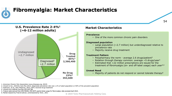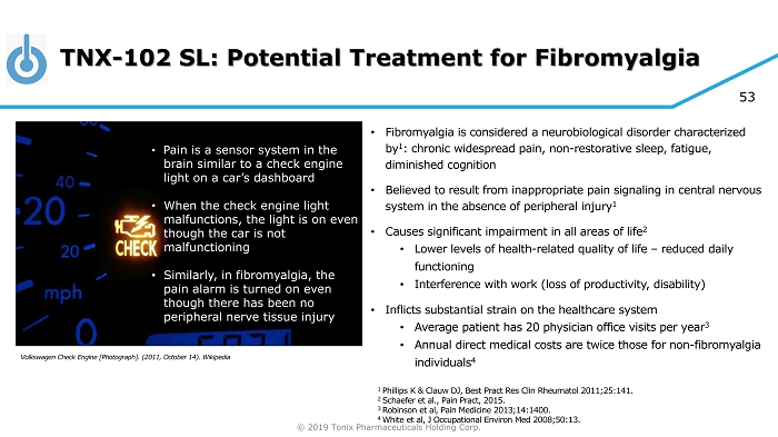© 2019 Tonix Pharmaceuticals Holding Corp. 53 Volkswagen Check Engine [Photograph]. (2011, October 14). Wikipedia • Pain is a sensor system in the brain similar to a check engine light on a car’s dashboard • When the check engine light malfunctions, the light is on even though the car is not malfunctioning • Similarly, in fibromyalgia, the pain alarm is turned on even though there has been no peripheral nerve tissue injury • Fibromyalgia is considered a neurobiological disorder characterized by 1 : chronic widespread pain, non - restorative sleep, fatigue, diminished cognition • Believed to result from inappropriate pain signaling in central nervous system in the absence of peripheral injury 1 • Causes significant impairment in all areas of life 2 • Lower levels of health - related quality of life – reduced daily functioning • Interference with work (loss of productivity, disability) • Inflicts substantial strain on the healthcare system • Average patient has 20 physician office visits per year 3 • Annual direct medical costs are twice those for non - fibromyalgia individuals 4 TNX - 102 SL: Potential Treatment for Fibromyalgia 1 Phillips K & Clauw DJ, Best Pract Res Clin Rheumatol 2011;25:141. 2 Schaefer et al., Pain Pract , 2015. 3 Robinson et al, Pain Medicine 2013;14:1400. 4 White et al, J Occupational Environ Med 2008;50:13.