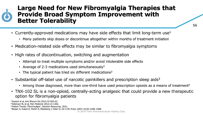 © 2019 Tonix Pharmaceuticals Holding Corp. 55 Fewer than Half of Those Treated for Fibromyalgia Receive Complete Relief from the Three FDA - Approved Drugs 1 • The treatment objective is to restore functionality and quality of life by broadly improving symptoms while avoiding significant side effects • The majority fail therapy due to lack of a response or poor tolerability 2 Respond, but intolerant of side effects Do not respond 25% 35% 60% failure rate 1 The three drugs with FDA approval for the treatment of fibromyalgia: Pregabalin (Lyrica); Duloxetine (Cymbalta); Milnacipran ( Savella ) 2 Market research by Frost & Sullivan, commissioned by Tonix (2011) Treated Population