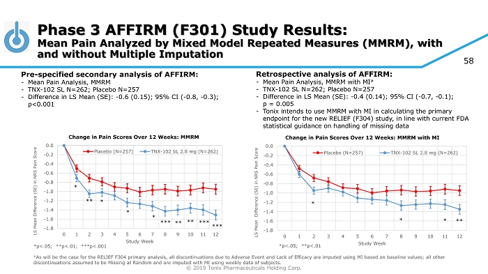 © 2019 Tonix Pharmaceuticals Holding Corp. 57 TNX - 102 SL 2.8 mg for Fibromyalgia: Summary of Completed Phase 3 AFFIRM Study (F301) and Results General s tudy c haracteristics: • Randomized, 12 - week, double - blind, placebo - controlle d Phase 3 study of TNX - 102 SL 2.8 mg (half the dose being developed for PTSD) taken daily at bedtime (n=519) • Patients had to satisfy the 2010 ACR Preliminary Diagnostic Classification Criteria • Primary endpoint: Weekly average pain improvement as a 30% responder analysis • Secondary endpoints: PGIC, FIQ - R Symptom Domain, FIQ - R Function Domain, Daily Sleep Quality Diary, PROMIS Sleep Disturbance Efficacy results: • Completers: 425 (81.9%) of 519 patients in Intent - to - Treat population • The primary analysis (responder analysis) was not statistically significant (P=0.095). However, the pre - specified secondary analysis of average pain improvement after 12 weeks of treatment showed P<0.001, mixed model repeated measures (MMRM) • Significant improvements observed in sleep quality, patient global impression of change and fibromyalgia - specific measures (secondary analyses) PGIC = Patient Global Impression of Pain FIQ - R = Fibromyalgia Impact Questionnaire – Revised MMRM = mixed model repeated measures