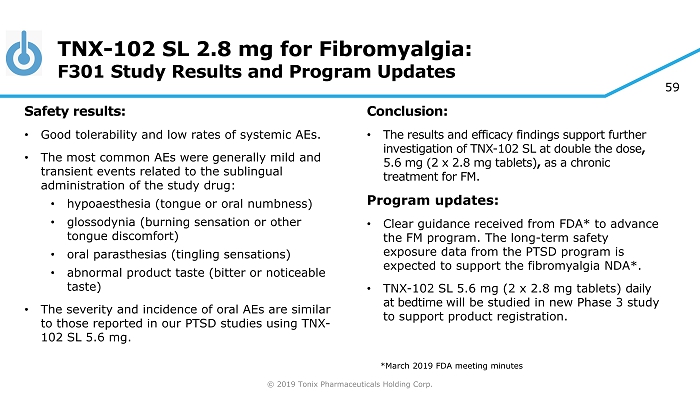 © 2019 Tonix Pharmaceuticals Holding Corp. 58 *p<.05; **p<.01; ***p<.001 # As will be the case for the RELIEF F304 primary analysis, all discontinuations due to Adverse Event and Lack of Efficacy are imp uted using MI based on baseline values; all other discontinuations assumed to be Missing at Random and are imputed with MI using weekly data of subjects. Phase 3 AFFIRM (F301) Study Results: Mean Pain Analyzed by Mixed Model Repeated Measures (MMRM), with and without Multiple Imputation Pre - specified secondary analysis of AFFIRM: - Mean Pain Analysis, MMRM - TNX - 102 SL N=262; Placebo N=257 - Difference in LS Mean (SE): - 0.6 (0.15); 95% CI ( - 0.8, - 0.3); p<0.001 Retrospective analysis of AFFIRM: - Mean Pain Analysis, MMRM with MI # - TNX - 102 SL N=262; Placebo N=257 - Difference in LS Mean (SE): - 0.4 (0.14); 95% CI ( - 0.7, - 0.1); p = 0.005 - Tonix intends to use MMRM with MI in calculating the primary endpoint for the new RELIEF (F304) study, in line with current FDA statistical guidance on handling of missing data -1.8 -1.6 -1.4 -1.2 -1.0 -0.8 -0.6 -0.4 -0.2 0.0 0 1 2 3 4 5 6 7 8 9 10 11 12 LS Mean Difference (SE) in NRS Pain Score Study Week Change in Pain Scores Over 12 Weeks: MMRM with MI Placebo (N=257) TNX-102 SL 2.8 mg (N=262) * * * ** *p<.05; **p<.01 -1.8 -1.6 -1.4 -1.2 -1.0 -0.8 -0.6 -0.4 -0.2 0.0 0 1 2 3 4 5 6 7 8 9 10 11 12 LS Mean Difference (SE) in NRS Pain Score Study Week Change in Pain Scores Over 12 Weeks: MMRM Placebo (N=257) TNX-102 SL 2.8 mg (N=262) * ** *** * * * *** *** ** **
