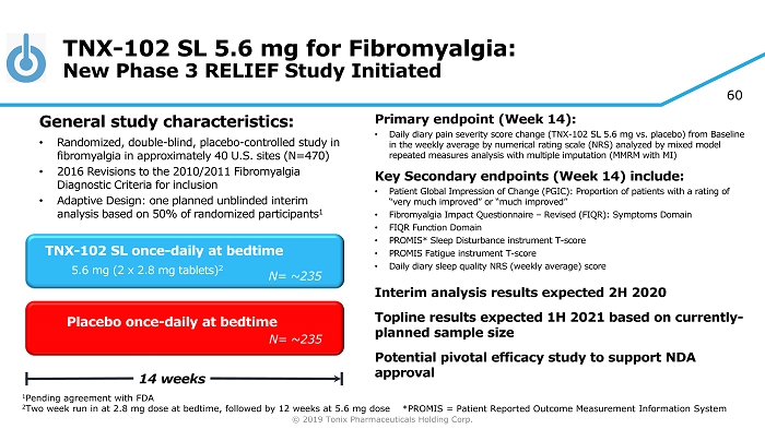 © 2019 Tonix Pharmaceuticals Holding Corp. 59 TNX - 102 SL 2.8 mg for Fibromyalgia: F301 Study Results and Program Updates Safety results: • Good tolerability and low rates of systemic AEs. • The most common AEs were generally mild and transient events related to the sublingual administration of the study drug: • hypoaesthesia (tongue or oral numbness) • glossodynia (burning sensation or other tongue discomfort) • oral parasthesias (tingling sensations) • abnormal product taste (bitter or noticeable taste) • The severity and incidence of oral AEs are similar to those reported in our PTSD studies using TNX - 102 SL 5.6 mg. Conclusion: • The results and efficacy findings support further investigation of TNX - 102 SL at double the dose , 5.6 mg (2 x 2.8 mg tablets) , as a chronic treatment for FM. Program updates: • Clear guidance received from FDA* to advance the FM program. The long - term safety exposure data from the PTSD program is expected to support the fibromyalgia NDA*. • TNX - 102 SL 5.6 mg (2 x 2.8 mg tablets) daily at bedtime will be studied in new Phase 3 study to support product registration. *March 2019 FDA meeting minutes