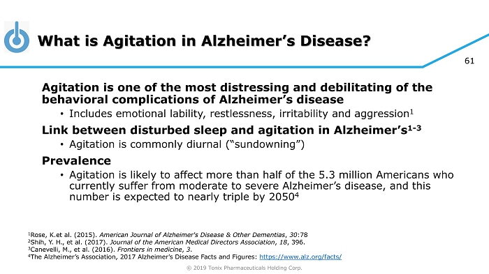 © 2019 Tonix Pharmaceuticals Holding Corp. 61 What is Agitation in Alzheimer’s Disease? Agitation is one of the most distressing and debilitating of the behavioral complications of Alzheimer’s disease • Includes emotional lability, restlessness, irritability and aggression 1 Link between disturbed sleep and agitation in Alzheimer’s 1 - 3 • Agitation is commonly diurnal (“ sundowning ”) Prevalence • Agitation is likely to affect more than half of the 5.3 million Americans who currently suffer from moderate to severe Alzheimer’s disease, and this number is expected to nearly triple by 2050 4 1 Rose, K.et al. (2015). American Journal of Alzheimer's Disease & Other Dementias , 30 :78 2 Shih, Y. H., et al. (2017). Journal of the American Medical Directors Association , 18 , 396. 3 Canevelli, M., et al. (2016). Frontiers in medicine , 3 . 4 The Alzheimer’s Association, 2017 Alzheimer’s Disease Facts and Figures: https://www.alz.org/facts/