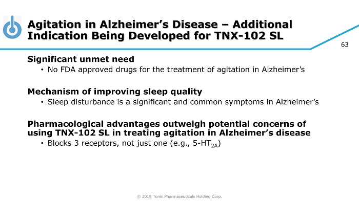 © 2019 Tonix Pharmaceuticals Holding Corp. 62 Consequences of Agitation in Alzheimer’s Disease Outcomes • Agitation is associated with significant poor outcomes for Alzheimer’s patients and challenges for their caregivers Common reason for institutionalization • Development of agitation, or its worsening, is one of the most common reasons for patients having to transition from lower - to higher levels of care (nursing homes and other long - term care settings) 1 Cost • The presence of agitation nearly doubles the cost of caring for patients with Alzheimer’s disease, and agitation is estimated to account for more than 12% of the healthcare and societal cost of Alzheimer’s disease, which is currently estimated to be $256 Billion for the year 2017 in the United States 1 1 The Alzheimer’s Association, 2017 Alzheimer’s Disease Facts and Figures: https://www.alz.org/facts/