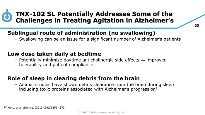 © 2019 Tonix Pharmaceuticals Holding Corp. 64 TNX - 102 SL for Agitation in Alzheimer’s – Regulatory Status and Registration Strategy Proposed Phase 2 IND study can potentially serve as a pivotal efficacy study to support NDA approval • FDA comments on final protocol received October 2018 Registration Strategy of TNX - 102 SL for agitation in Alzheimer’s disease • Efficacy Supplement (sNDA 1 ) may be leveraged from the PTSD/FM development program and supported by Initial NDA approval for PTSD/FM 1 Supplemental New Drug Application