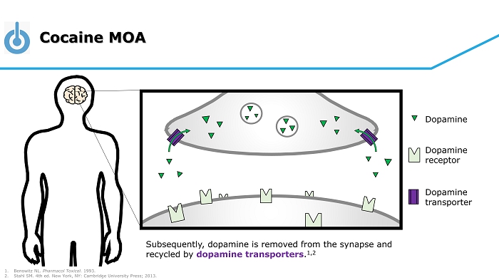 Cocaine MOA Dopamine Dopamine receptor Dopamine transporter Subsequently, dopamine is removed from the synapse and recycled by dopamine transporters . 1,2 1. Benowitz NL. Pharmacol Toxicol . 1993. 2. Stahl SM. 4th ed. New York, NY: Cambridge University Press; 2013.