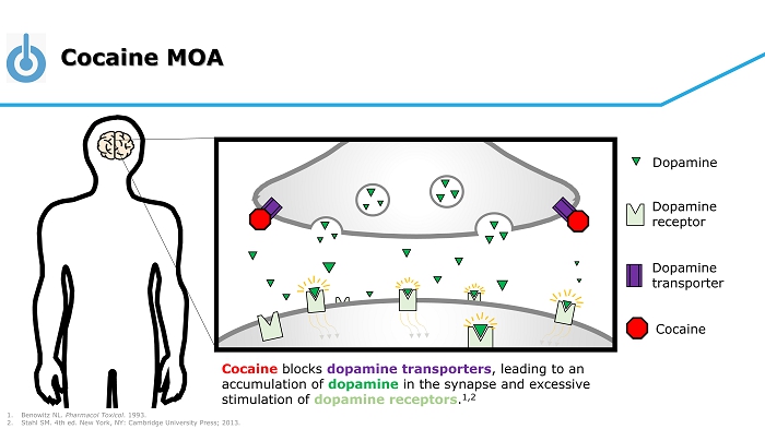 Cocaine MOA Cocaine blocks dopamine transporters , leading to an accumulation of dopamine in the synapse and excessive stimulation of dopamine receptors . 1,2 Cocaine Dopamine Dopamine receptor Dopamine transporter 1. Benowitz NL. Pharmacol Toxicol . 1993. 2. Stahl SM. 4th ed. New York, NY: Cambridge University Press; 2013.