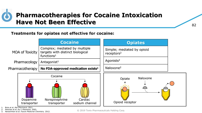 © 2019 Tonix Pharmaceuticals Holding Corp. 77 About Cocaine and Cocaine Intoxication Cocaine: an illegal recreational drug taken for its pleasurable effects and associated euphoria. • Cocaine blocks the reuptake of the neurotransmitter dopamine (DA) in the CNS • Results in accumulation of DA within the synapse and amplifies DA signaling • Creates positive feeling but with intense use of cocaine, results in cocaine craving • High potential for abuse/addiction (dependence), and risk of cocaine intoxication. Cocaine intoxication: deleterious effects on the body, especially cardiovascular system. • Common symptoms include tachyarrhythmias and elevated blood pressure, either of which can be life - threatening. • Known or suspected cocaine intoxication cases are sent immediately to the emergency department, preferably by ambulance in case cardiac arrest occurs during transit.