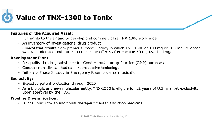© 2019 Tonix Pharmaceuticals Holding Corp. Value of TNX - 1300 to Tonix Features of the Acquired Asset: • Full rights to the IP and to develop and commercialize TNX - 1300 worldwide • An inventory of investigational drug product • Clinical trial results from previous Phase 2 study in which TNX - 1300 at 100 mg or 200 mg i.v. doses was well tolerated and interrupted cocaine effects after cocaine 50 mg i.v. challenge Development Plan: • Re - qualify the drug substance for Good Manufacturing Practice (GMP) purposes • Conduct non - clinical studies in reproductive toxicology • Initiate a Phase 2 study in Emergency Room cocaine intoxication Exclusivity: • Expected patent protection through 2029 • As a biologic and new molecular entity, TNX - 1300 is eligible for 12 years of U.S. market exclusivity upon approval by the FDA. Pipeline Diversification: • Brings Tonix into an additional therapeutic area: Addiction Medicine