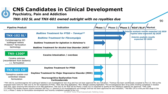 © 2019 Tonix Pharmaceuticals Holding Corp. 90 CNS Candidates in Clinical Development Psychiatry, Pain and Addiction Phase 2 NDA 3 /BLA 4 Market Pipeline Product Indication Phase 3 TNX - 102 SL 1 Bedtime Treatment for PTSD – Tonmya ®2 Daytime Treatment for PTSD TNX - 601 CR 7 TNX - 1300 6 Cocaine intoxication / overdose Cyclobenzaprine HCl sublingual tablets Protectic ® formulation technology Tianeptine oxalate oral controlled release formulation Cocaine esterase (recombinant from bacteria) i.v. formulation Phase 1 Bedtime Treatment for Fibromyalgia TNX - 102 SL and TNX - 601 owned outright with no royalties due Bedtime Treatment for Agitation in Alzheimer’s Neurocognitive Dysfunction from Corticosteroids Bedtime Treatment for Alcohol Use Disorder (AUD) 5 1 TNX - 102 SL (cyclobenzaprine HCl sublingual tablets) is an investigational new drug and has not been approved for any indication; 2 Tonmya has been conditionally accepted by the U.S. FDA as the proposed trade name for TNX - 102 SL for the treatment of PTSD. 3 NDA - New Drug Application; 4 BLA – Biologic Licensing Application; 5 Pre - Investigational New Drug (IND) meeting completed in October with FDA. Upon receiving FDA clearance of an IND application, TNX - 102 SL for AUD will be Phase 2 ready as it is expected to qual ify for the 505(b)(2) pathway for approval; 6 TNX - 1300 (T172R/G173Q double - mutant cocaine esterase 200 mg, i.v. solution) is an investigational new biologic and has not been approved for any indication; 7 TNX - 601 CR is in the pre - IND stage in the U.S.; a Phase 1 study for formulation development was recently completed outside of the U.S. Interim analysis results expected 1Q 2020 Topline data expected 2Q 2020 Interim analysis results expected 2H 2020 Daytime Treatment for Major Depressive Disorder (MDD)