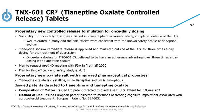 © 2019 Tonix Pharmaceuticals Holding Corp. 92 TNX - 601 CR* (Tianeptine Oxalate Controlled Release) Tablets Proprietary new controlled release formulation for once - daily dosing • Suitability for once - daily dosing established in Phase 1 pharmacokinetic study, completed outside of the U.S. • Well tolerated in study and the side effects were consistent with the known safety profile of tianeptine sodium • Tianeptine sodium immediate release is approved and marketed outside of the U.S. for three times a day dosing for the treatment of depression • Once - daily dosing for TNX - 601 CR believed to be have an adherence advantage over three times a day dosing with tianeptine sodium • Plan to request pre - IND meeting with FDA in first half 2020 • Plan for first efficacy and safety study ex - U.S. Proprietary new oxalate salt with improved pharmaceutical properties • Tianeptine oxalate is crystalline, while tianeptine sodium is amorphous Issued patents directed to tianeptine and tianeptine oxalate • Composition of Matter: Issued US patent directed to oxalate salt, U.S. Patent No. 10,449,203 • Method of Use: Issued European patent directed to methods of treating cognitive impairment associated with corticosteroid treatment, European Patent No. 3246031 *TNX - 601 (tianeptine oxalate CR tablets) is in the pre - IND stage in the U.S. and has not been approved for any indication.