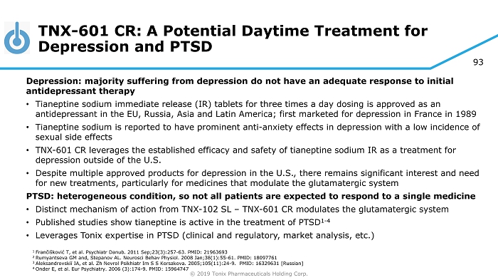 © 2019 Tonix Pharmaceuticals Holding Corp. 93 TNX - 601 CR : A Potential Daytime Treatment for Depression and PTSD Depression: majority suffering from depression do not have an adequate response to initial antidepressant therapy • Tianeptine sodium immediate release (IR) tablets for three times a day dosing is approved as an antidepressant in the EU, Russia, Asia and Latin America; first marketed for depression in France in 1989 • Tianeptine sodium is reported to have prominent anti - anxiety effects in depression with a low incidence of sexual side effects • TNX - 601 CR leverages the established efficacy and safety of tianeptine sodium IR as a treatment for depression outside of the U.S. • Despite multiple approved products for depression in the U.S., there remains significant interest and need for new treatments, particularly for medicines that modulate the glutamatergic system PTSD: heterogeneous condition, so not all patients are expected to respond to a single medicine • Distinct mechanism of action from TNX - 102 SL – TNX - 601 CR modulates the glutamatergic system • Published studies show tianeptine is active in the treatment of PTSD 1 - 4 • Leverages Tonix expertise in PTSD (clinical and regulatory, market analysis, etc.) 1 Frančišković T, et al. Psychiatr Danub . 2011 Sep;23(3):257 - 63. PMID: 21963693 2 Rumyantseva GM and, Stepanov AL. Neurosci Behav Physiol. 2008 Jan;38(1):55 - 61. PMID: 18097761 3 Aleksandrovskiĭ IA, et al. Zh Nevrol Psikhiatr Im S S Korsakova . 2005;105(11):24 - 9. PMID: 16329631 [Russian] 4 Onder E, et al. Eur Psychiatry. 2006 (3):174 - 9. PMID: 15964747