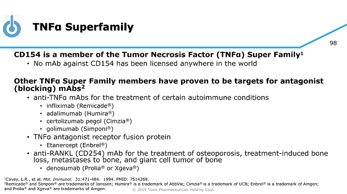 © 2019 Tonix Pharmaceuticals Holding Corp. 98 TNF α Superfamily CD154 is a member of the Tumor Necrosis Factor (TNF α ) Super Family 1 • No mAb against CD154 has been licensed anywhere in the world Other TNF α Super Family members have proven to be targets for antagonist (blocking) mAbs 2 • anti - TNFα mAbs for the treatment of certain autoimmune conditions • infliximab (Remicade ® ) • adalimumab (Humira ® ) • certolizumab pegol ( Cimzia ® ) • golimumab (Simponi ® ) • TNFα antagonist receptor fusion protein • Etanercept (Enbrel ® ) • anti - RANKL (CD254) mAb for the treatment of osteoporosis, treatment - induced bone loss, metastases to bone, and giant cell tumor of bone • denosumab (Prolia ® or Xgeva ® ) 1 Covey, L.R., et al. Mol. Immunol. 31:471 - 484. 1994. PMID: 7514269. 2 Remicade ® and Simponi ® are trademarks of Janssen; Humira ® is a trademark of AbbVie; Cimzia ® is a trademark of UCB; Enbrel ® is a trademark of Amgen; and Prolia ® and Xgeva ® are trademarks of Amgen.