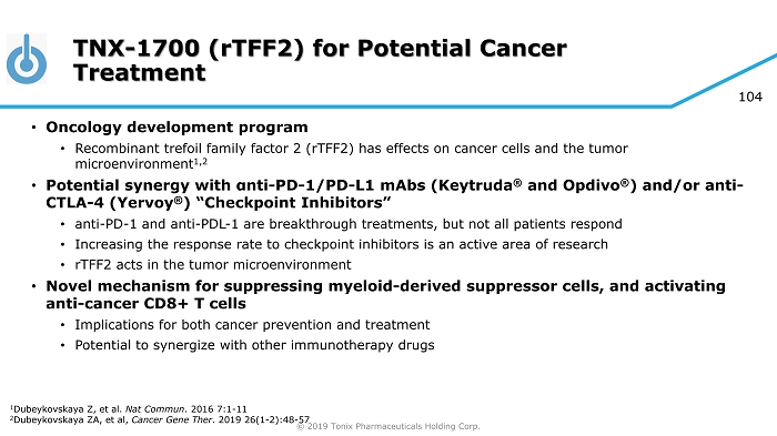 © 2019 Tonix Pharmaceuticals Holding Corp. 103 TNX - 1700 (rTFF2): A Potential Treatment for Gastric and Pancreatic Cancers Pre - IND Candidate Targeted as a treatment for Cancer x Particularly for gastric and pancreatic cancer x Mechanism of Action (MOA) is different from checkpoint inhibitors x Potential synergy with anti - PD - 1 or anti - PD - L1 monoclonal antibodies Patents and patent applications directed to rTFF2 • Issued patent licensed from Columbia University Inventor: Dr. Timothy Wang, MD • Chief, Division of Digestive and Liver Diseases at Columbia University and Cancer Research Center and Silberberg Professor of Medicine • Investigated the molecular mechanisms of gastrointestinal carcinogenesis for decades • Leadership roles in gastroenterology and cancer biology fields Targeting a Condition with Significant Unmet Need Pre - clinical evidence for inhibiting growth of cancer cells • Several studies have shown rTFF2 to be active in the treatment of cancer 1 - 2 1 Dubeykovskaya Z, et al. Nat Commun . 2016 7:1 - 11 2 Dubeykovskaya ZA, et al, Cancer Gene Ther . 2019 26(1 - 2):48 - 57