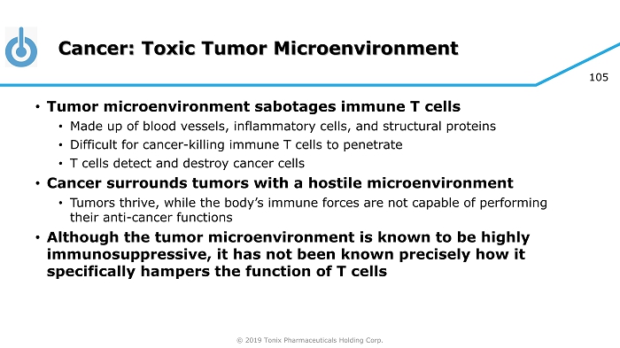 © 2019 Tonix Pharmaceuticals Holding Corp. 105 Cancer: Toxic Tumor Microenvironment • Tumor microenvironment sabotages immune T cells • Made up of blood vessels, inflammatory cells, and structural proteins • Difficult for cancer - killing immune T cells to penetrate • T cells detect and destroy cancer cells • Cancer surrounds tumors with a hostile microenvironment • Tumors thrive, while the body’s immune forces are not capable of performing their anti - cancer functions • Although the tumor microenvironment is known to be highly immunosuppressive, it has not been known precisely how it specifically hampers the function of T cells
